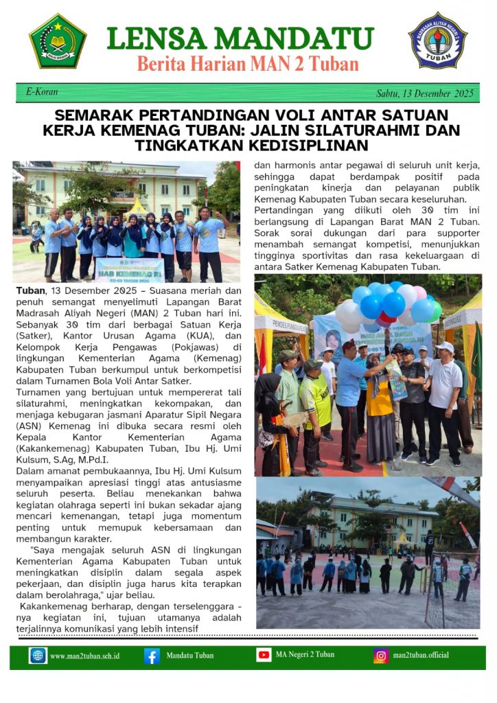 m@n2tuban Semarak Pertandingan Voli Antar Satuan Kerja Kemenag Tuban HumasMANDATU December 14, 2025 0 HumasMANDATU See author's posts Post Views: 7 Continue Reading Previous Pembukaan Perkemehan Bina Iman, Mental dan SKU Camp 2025Next Selamat dan Sukses Prestasi Siswa MAN 2 Tuban More Stories m@n2tuban HumasMANDATU December 16, 2025 0 m@n2tuban Perkemenahan Bina Iman, Mental dan SKU Camp 2025 Giat Pagi, Senam Bersama HumasMANDATU December 14, 2025 0 m@n2tuban Perkemehan Bina Iman, Mental dan SKU Camp 2025 Api Unggun dan Inagurasi Perkemahan HumasMANDATU December 14, 2025 0 Leave a Reply Cancel replyYour email address will not be published. Required fields are marked *Comment * Name * Email * Website Save my name, email, and website in this browser for the next time I comment. Δ