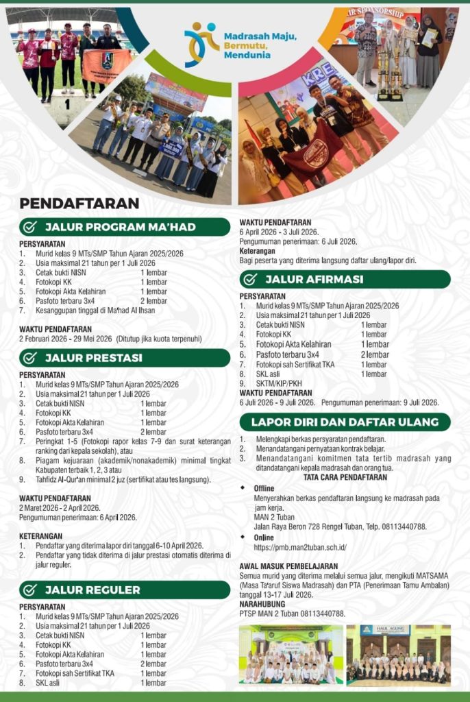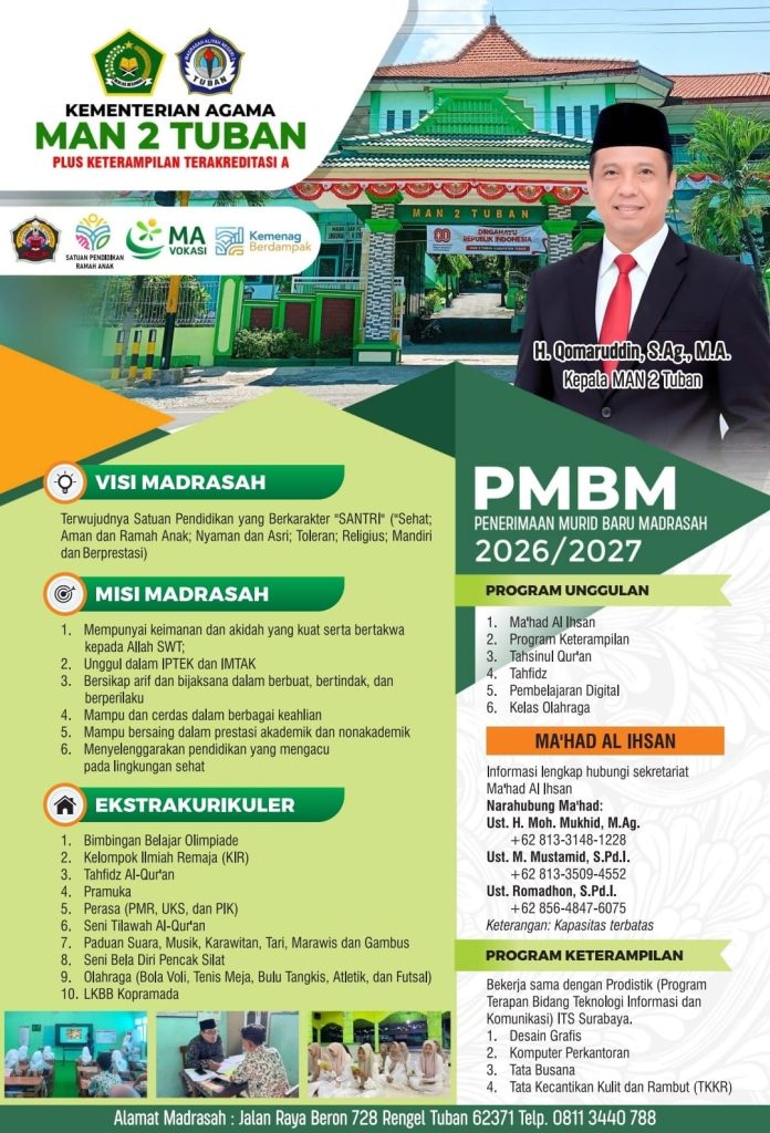 m@n2tuban Brosur Penerimaan Murid Baru 2026/2027 admin January 28, 2026 0 admin See author's posts Post Views: 9 Continue Reading Previous Satuan Kerja MAN 2 Tuban Hadiri Pembinaan Aparatur Sipil Negara serta Pemberian Penghargaan Kepada Guru dan Siswa Prestasi More Stories m@n2tuban Satuan Kerja MAN 2 Tuban Hadiri Pembinaan Aparatur Sipil Negara serta Pemberian Penghargaan Kepada Guru dan Siswa Prestasi HumasMANDATU January 20, 2026 0 m@n2tuban Satbinmas Polres Tuban Memberi Amanat Upacara Bendera Untuk Mewujudkan Murid Budiman HumasMANDATU January 19, 2026 0 m@n2tuban Pasukan Komando Paskibra MAN 2 Tuban Raih Gemilang Prestasi Tingkat Jawa Timur HumasMANDATU January 18, 2026 0 Leave a Reply Cancel replyYour email address will not be published. Required fields are marked *Comment * Name * Email * Website Save my name, email, and website in this browser for the next time I comment. Δ